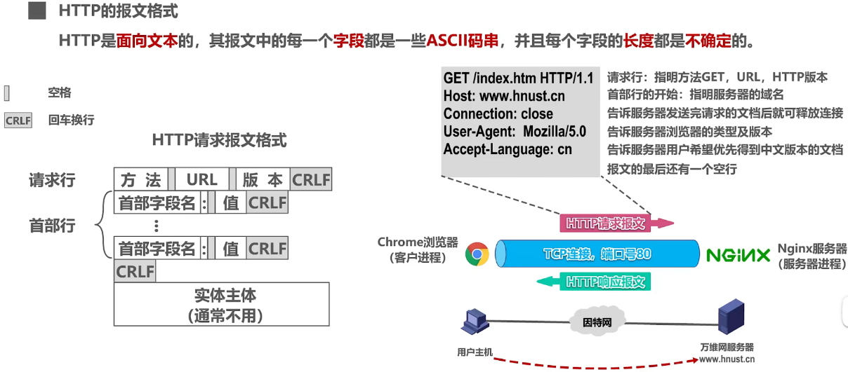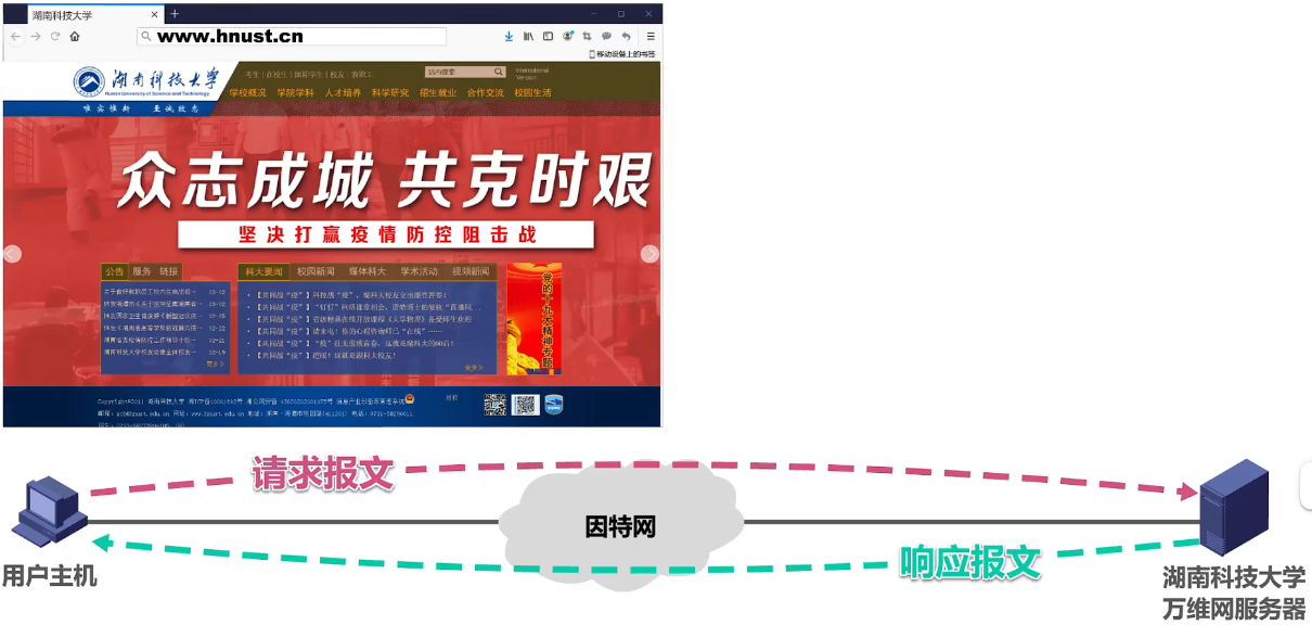 主机用浏览器输入域名,将请求报文发送给web服务器,之后服务器发送响应报文给主机。浏览器解析响应报文的内容,将网页内容展示出来。