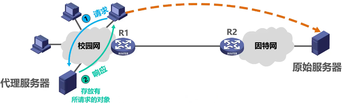 当校园网的某台主机要访问因特网上的原始服务器时,首先会向校园网中的代理服务器发出请求