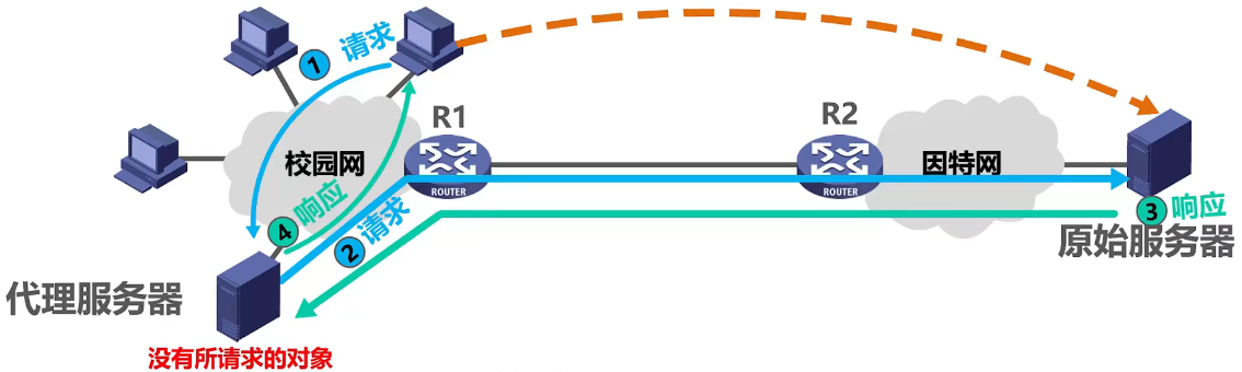 若代理服务器没有存放有所请求的对象,则代理服务器会向原始服务器发送请求,原始服务器将包含所请求对象的响应发回给代理服务器