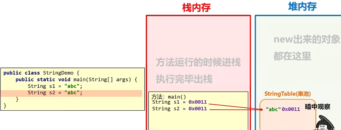 如果没有就添加进常量池中,再将对应的地址如0x0011赋值给s1。如果有就直接将对应的地址赋值给对应的String对象,如s2。