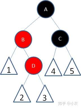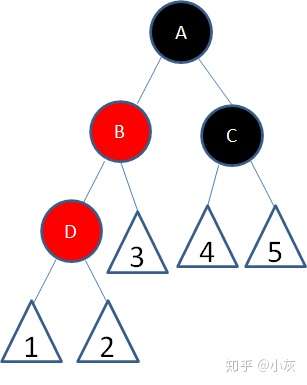 这样一来,结点B所在路径凭空多了一个黑色结点,打破了规则5。因此我们让结点A变为红色: