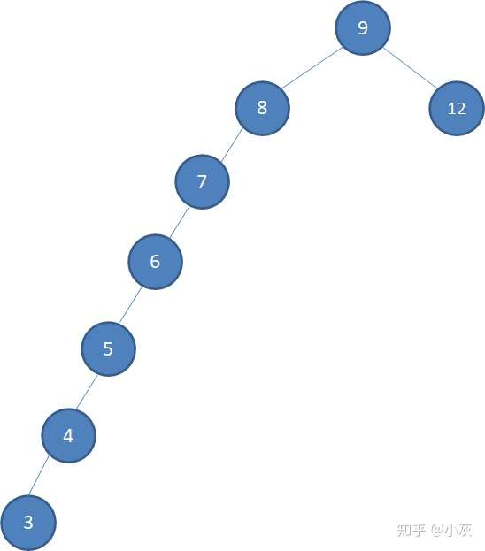 接下来我们依次插入如下五个结点:7,6,5,4,3。依照二叉查找树的特性,结果会变成什么样呢?