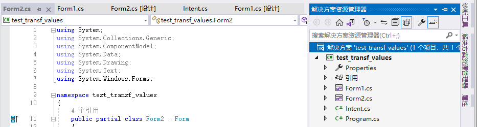 Intent.cs是解决方案的核心,使用一个Key-Values的字典dict,这个字典用于存放窗体与窗体之间传递的数值,dict左边的key用string,右边的values用Object,这样面对不同的数值传递都可以应付。同时将这个字典dict直接设置成public static,调用不用这么麻烦。