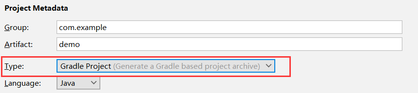 点击下一步应该选择Gradle Project,这样就会自动生成必须的文件夹及启动文件 SpringBootApplication 和 ServletInitializer