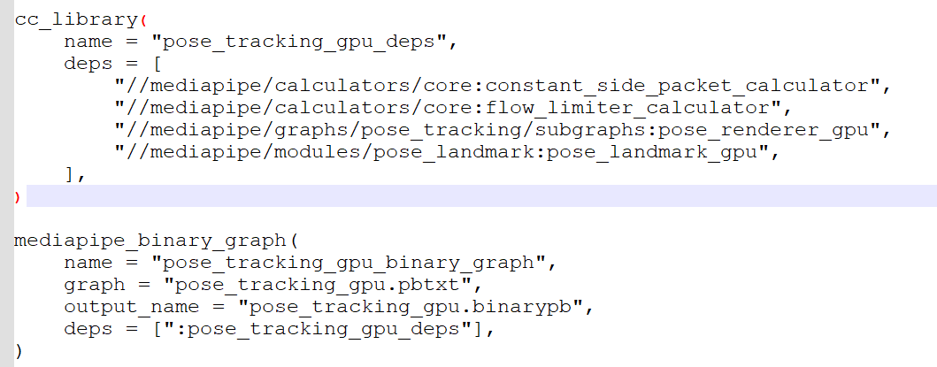 其中目录 pose_tracking 就是使用到的模型,支持的计算单元需要查看该目录下的 BUILD 文件中的 cc_library 节点,可以有多个这样的节点 ,这里使用 pose_tracking_gpu_deps 计算单元