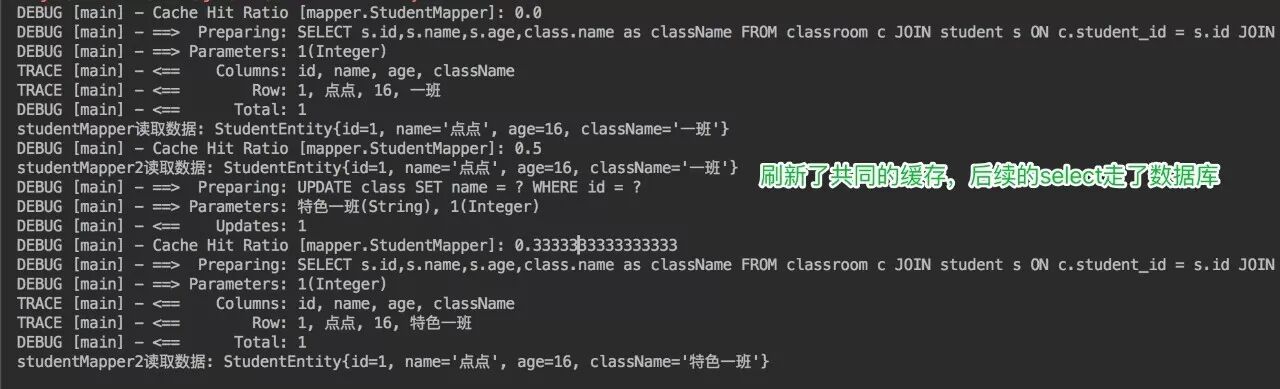 为了解决实验4的问题呢,可以使用Cache ref,让ClassMapper引用StudenMapper命名空间,这样两个映射文件对应的Sql操作都使用的是同一块缓存了。
