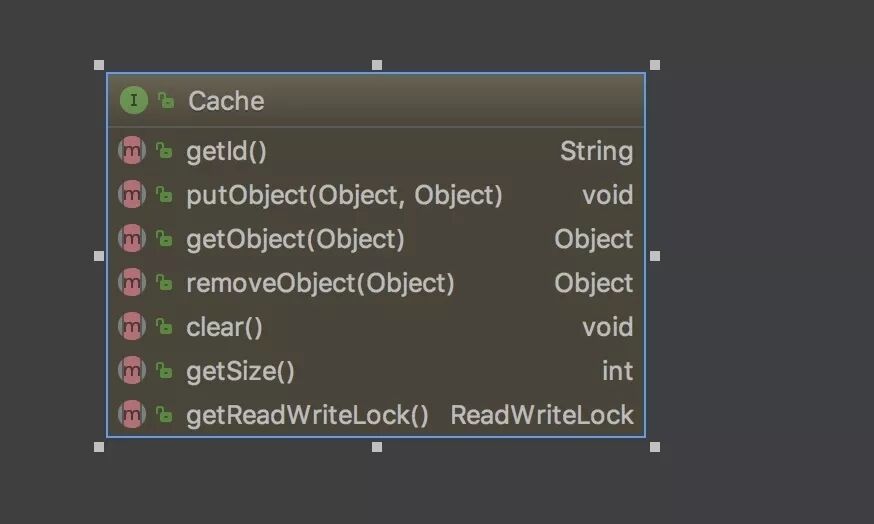Cache: MyBatis中的Cache接口,提供了和缓存相关的最基本的操作,如下图所示。