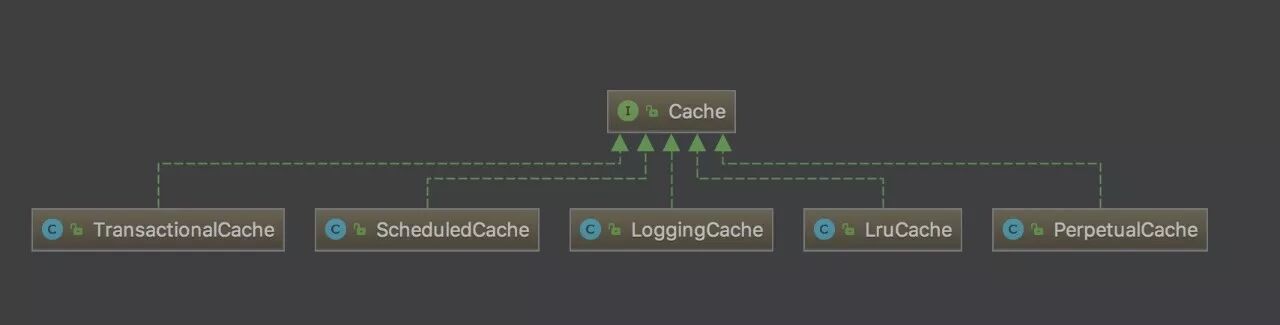 SynchronizedCache -> LoggingCache -> SerializedCache -> LruCache -> PerpetualCache。