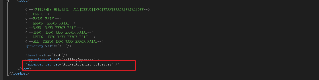 在cfgfile目录中的log4net.Config文件中 加入appender 支持SqlServer的配置文件