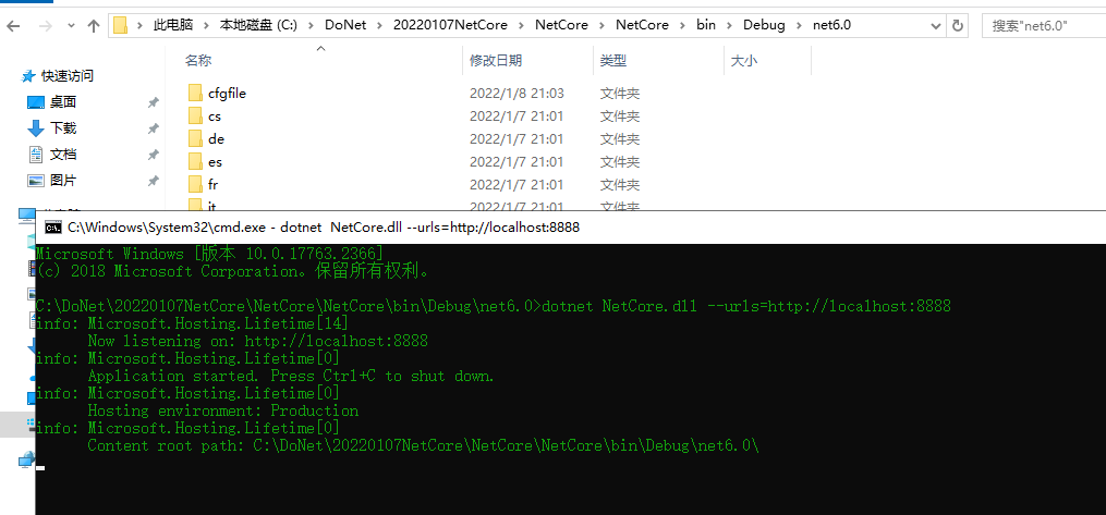输入 dotnet 程序.dll --urls=http://localhost:8888 启动