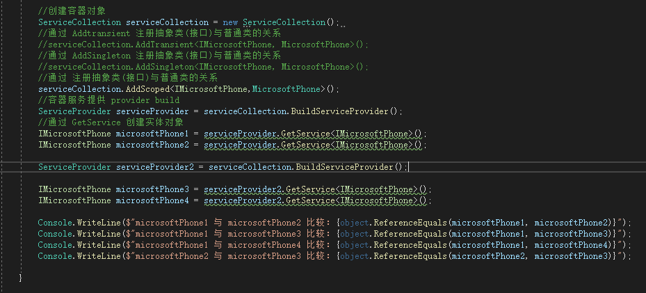 3、作用域生命周期 AddScoped 同一个 ServicePorvider 创建出来的也是同一个实例
