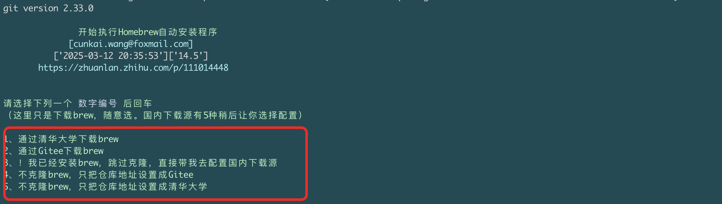/bin/zsh -c "$(curl -fsSL https://gitee.com/cunkai/HomebrewCN/raw/master/Homebrew.sh)"这个是真无脑智能适合国人宝宝体质的安装脚本,安装完brew后,我们就可以愉快的玩耍了