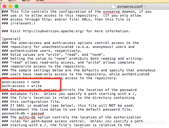 (1)svn服务配置文件:在conf目录下,文件名为svnserve.conf