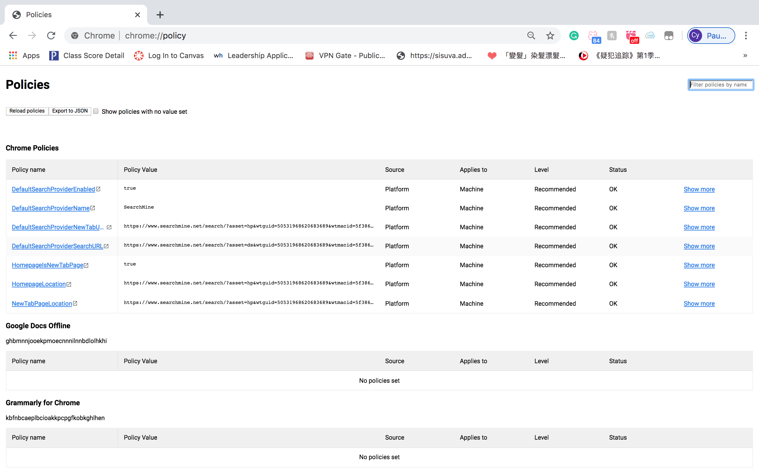 There are 1 configuration profiles installed5)然后她反馈回来的Chrome policy是下面这样的: