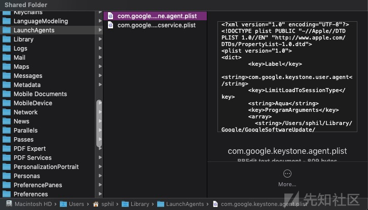 在macOS上实现驻留的最常见方式是通过LaunchAgent。Mac用户在Library文件夹下都有一个LaunchAgent文件夹,用来指定用户每次登陆后要执行的代码。系统还有一个自己的LaunchAgents文件夹。因为该文件夹是由于macOS自己管理的,默认请求下恶意软件不会进入该文件夹。