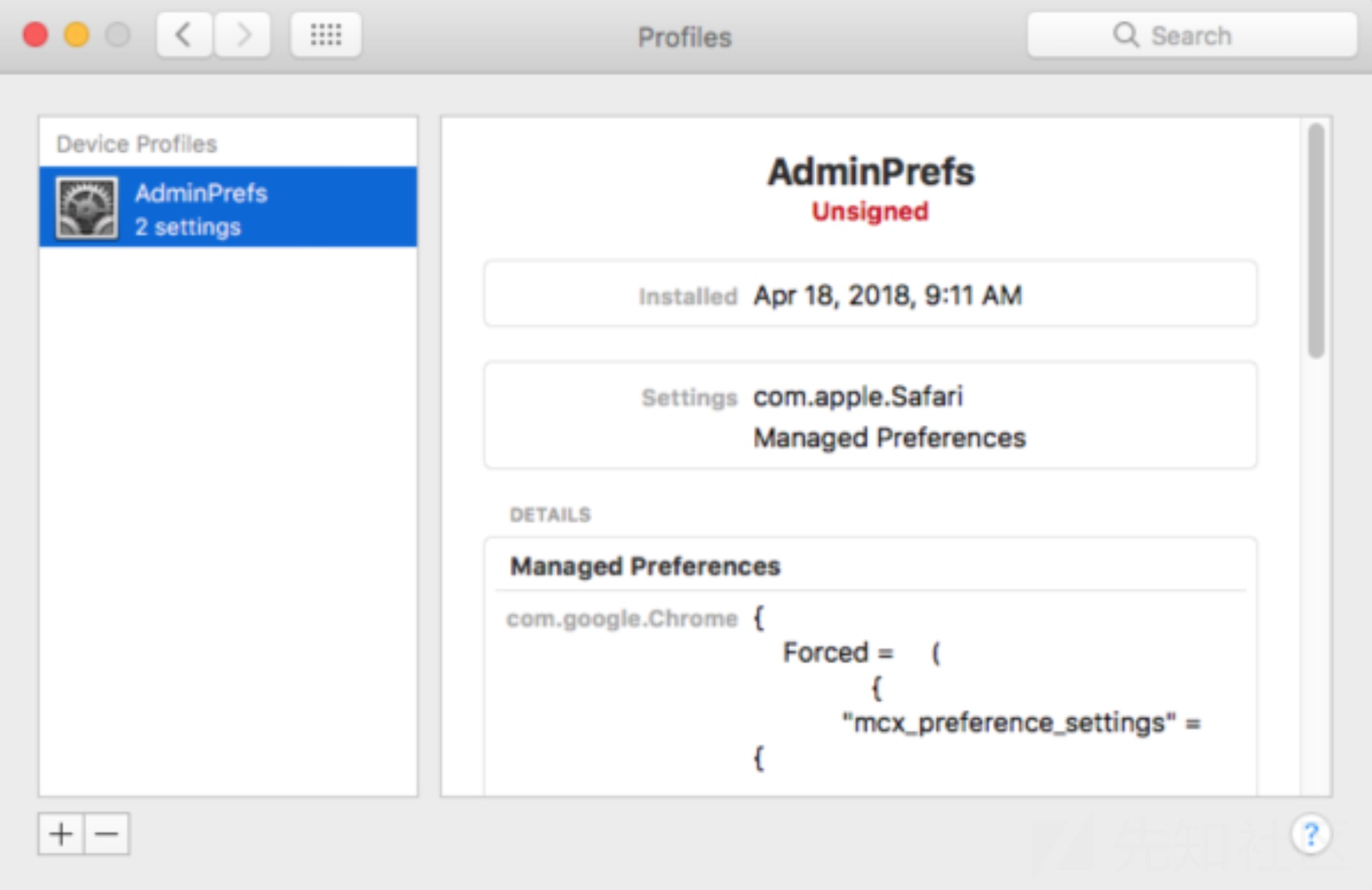 Profiles一般是组织使用,允许IT管理员管理用户机器,但被恶意软件作者误用了。随着Profiles通过邮件或网站传播,诱使用户安装只是社会工程的一个元素。