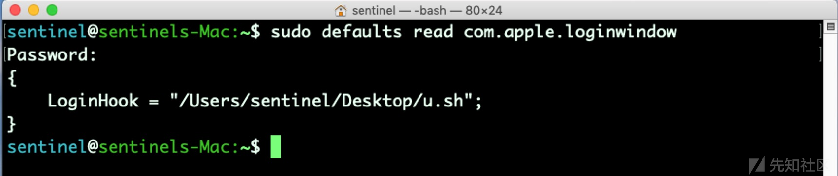 写这些hook很简单,但是检查这些文件是否存在也很简单。下面的命令就可以返回是否有LoginHook或LogoutHook值的结果:sudo defaults read com.apple.loginwindow