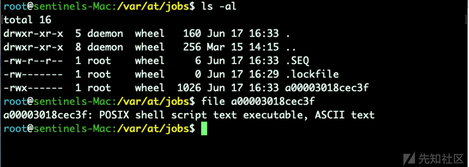 可以通过枚举/var/at/jobs目录来检查计划任务的at jobs。Jobs的前缀有一个字母a,名字为十六进制风格,如下图所示: