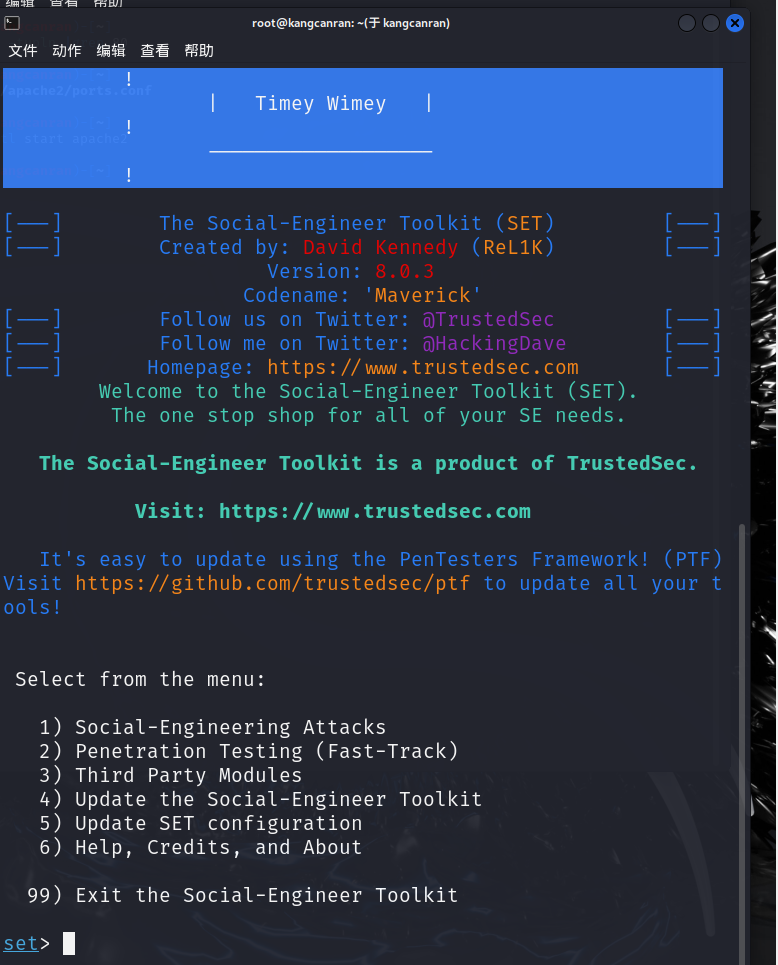 打开一个新的终端窗口,进入root模式,输入setoolkit打开SET工具: