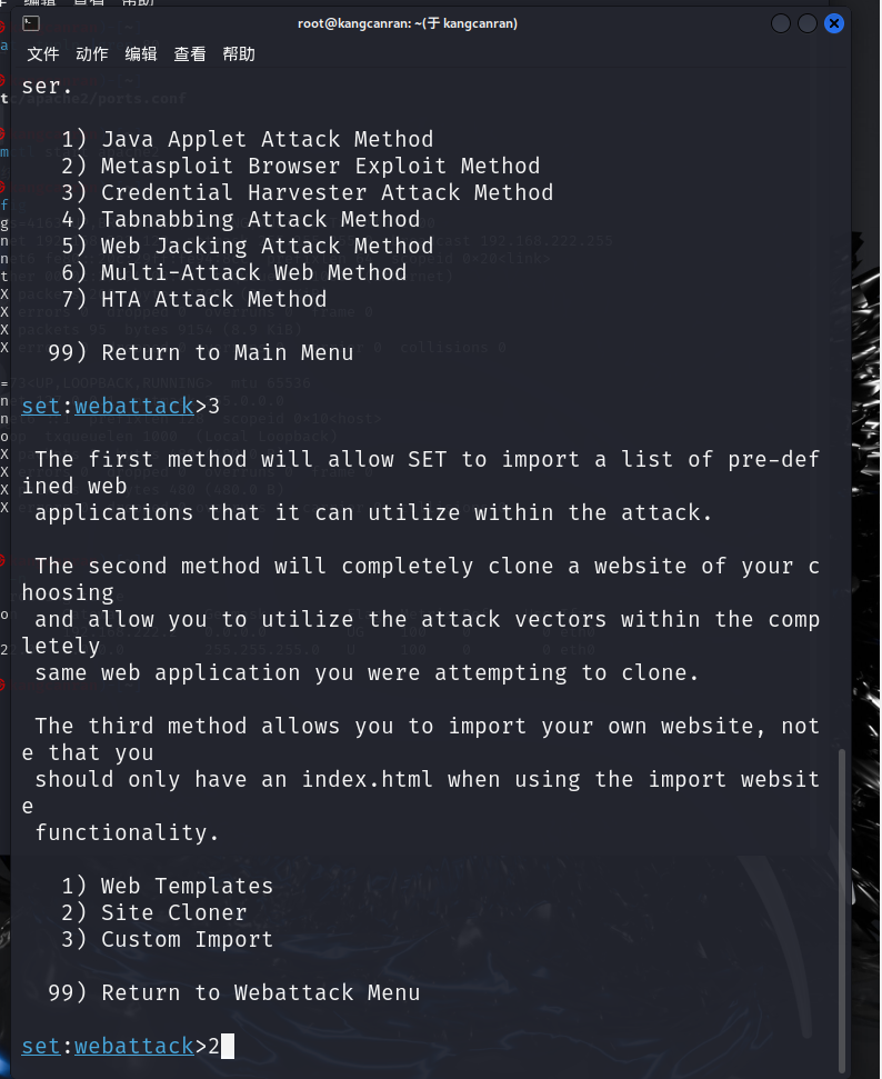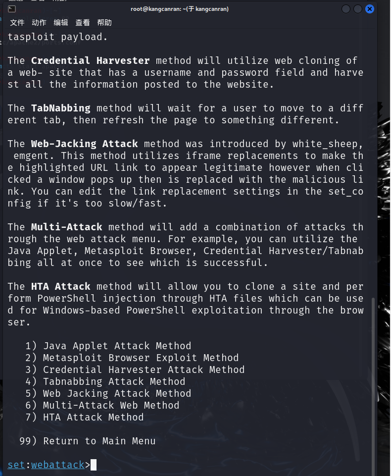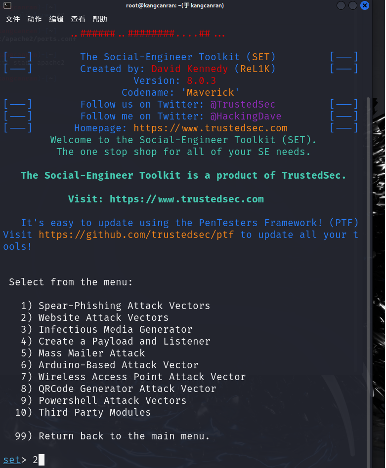 接着可以看到一连串的选项,首先选择1(社会工程学攻击)