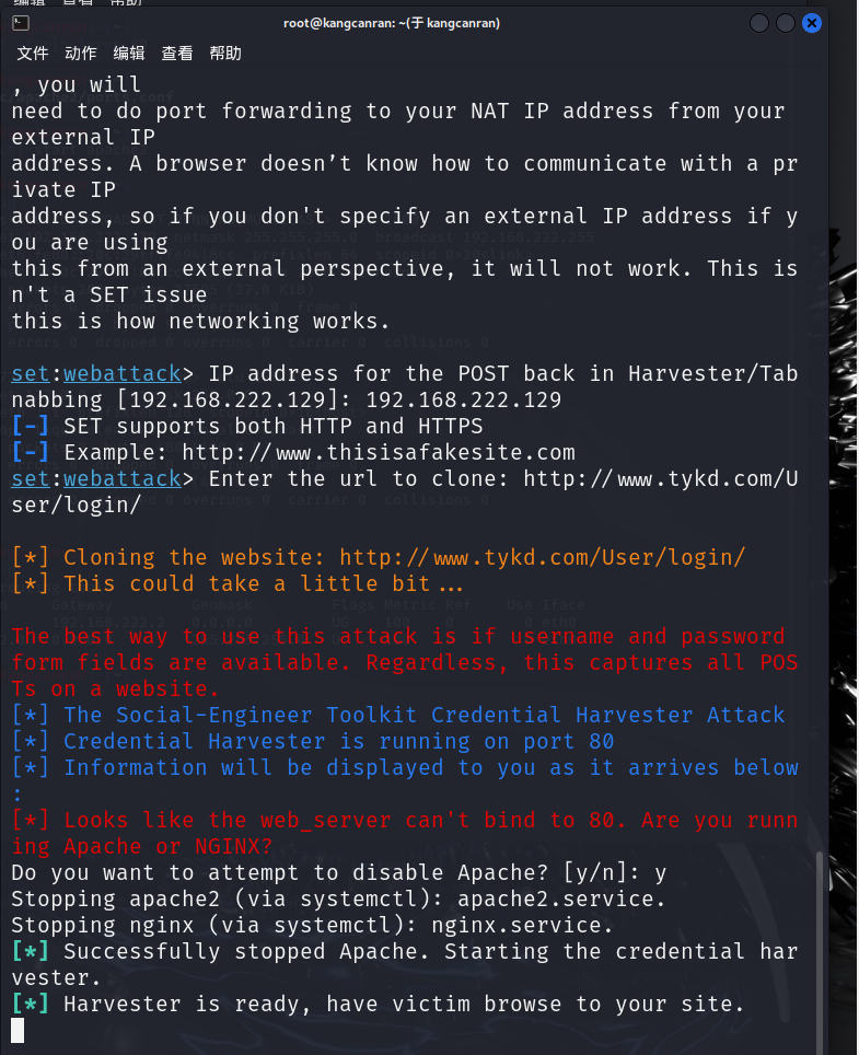 再按照提示输入要克隆的url之后(我选择的是天翼快递:http://www.tykd.com/User/login/ ),用户登录密码截取网页已经在攻击机的80端口上准备就绪: