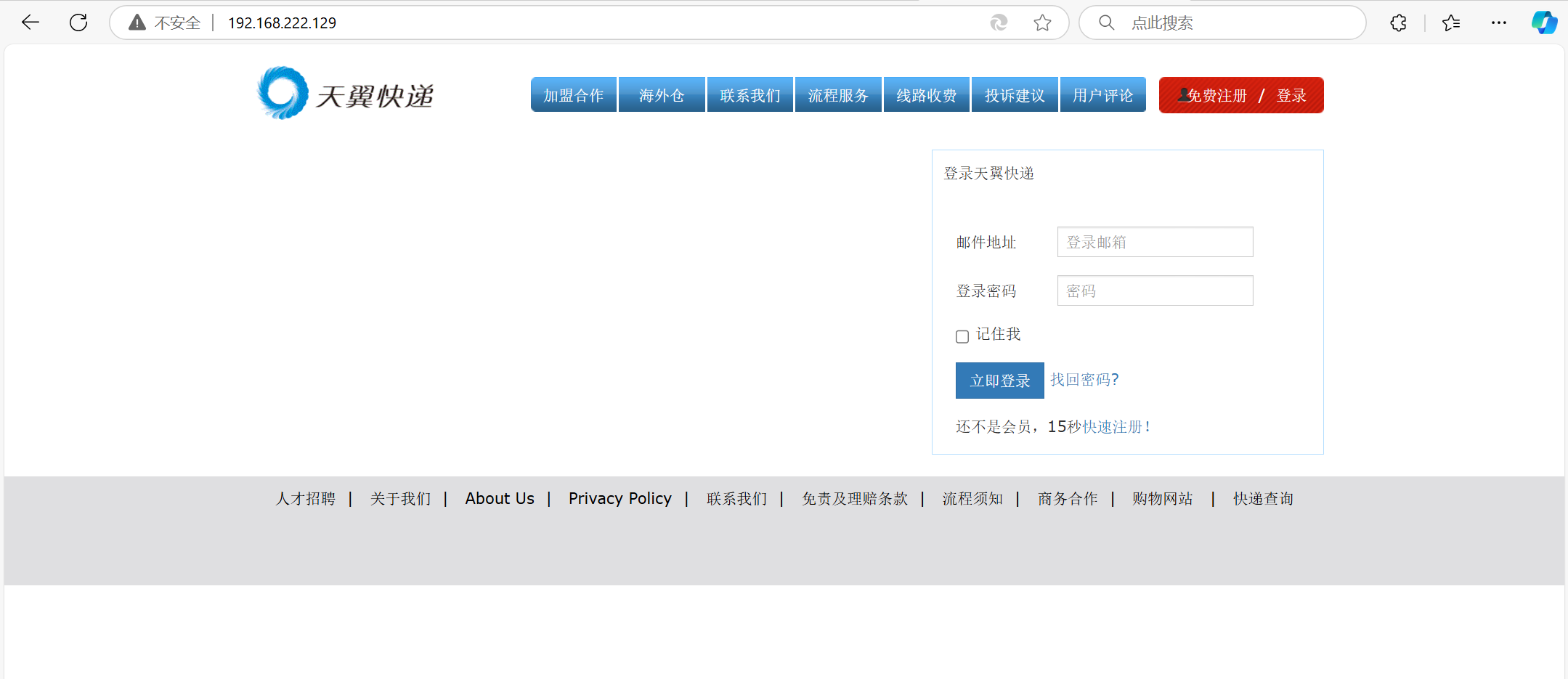 在靶机里(此处我直接用了自己主机)里输入网址:192.168.222.129(kali的IP地址),发现进入了天翼快递登录页面,即成功进入钓鱼网站: