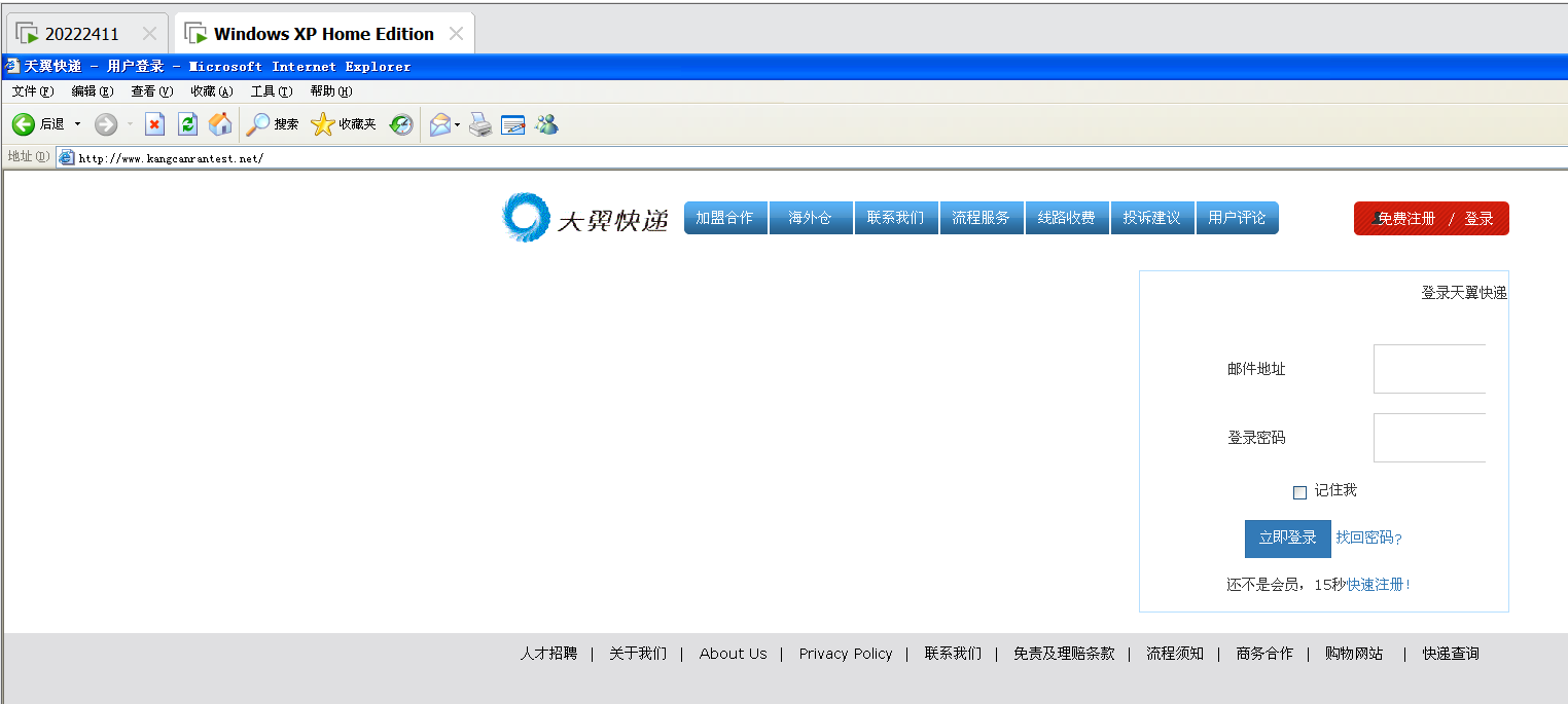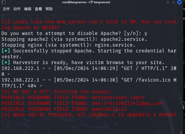 在靶机的浏览器上访问网址www.kangcanrantest.net,进入了天翼快递登陆页面(冒名网站),输入邮箱账号和密码(kcr20222411@qq.com和20222411),回到攻击机可以看到账号信息,欺骗成功: