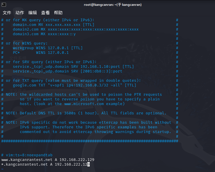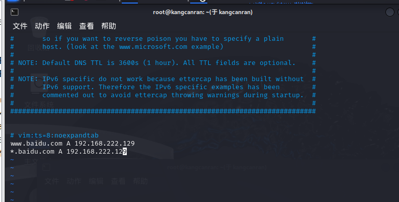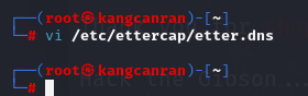 输入命令vim /etc/ettercap/etter.dns对DNS缓存表进行修改,可以添加几条对网站和IP的DNS记录,其中的IP地址是kali主机的IP: