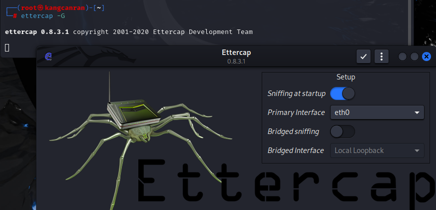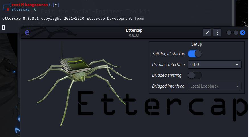 接着点击右上角的地球“MITM”,选择“ARP poisoning…”,点击“ok”: