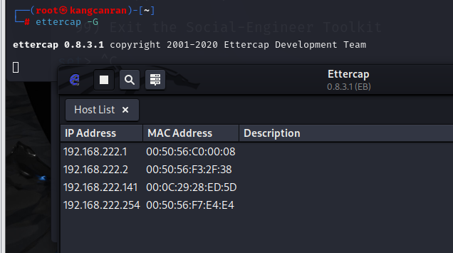 此时新开一个终端查一下网关IP,可得网关Gateway的IP为192.168.222.2: