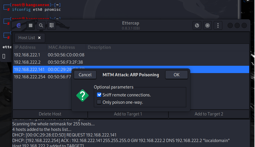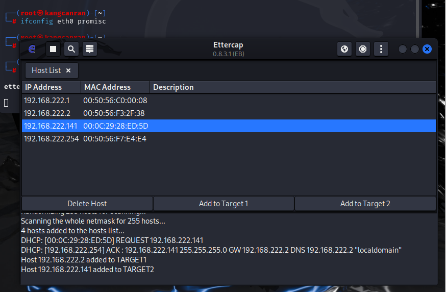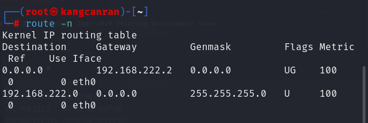 将192.168.222.2(网关,通过route -n命令查看)Add to Target1,将192.168.222.141(windows xp的IP地址)Add to Target2 。