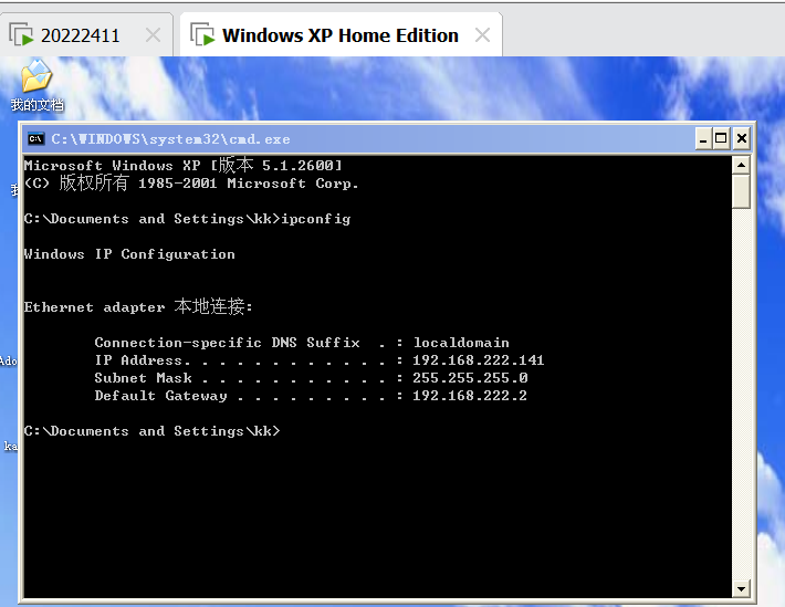 再开启WindowsXP,查询一下其IP地址为192.168.222.141: