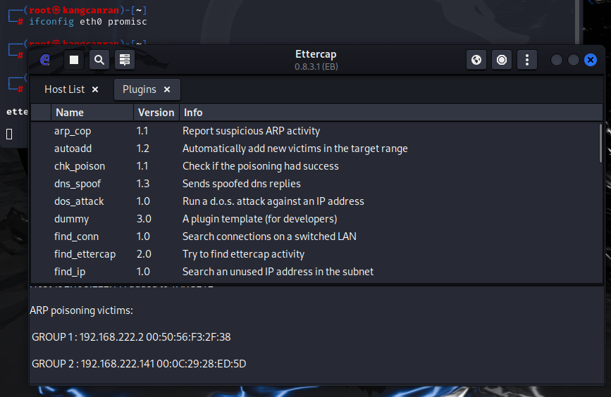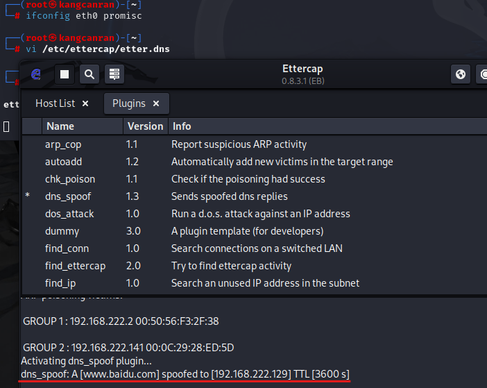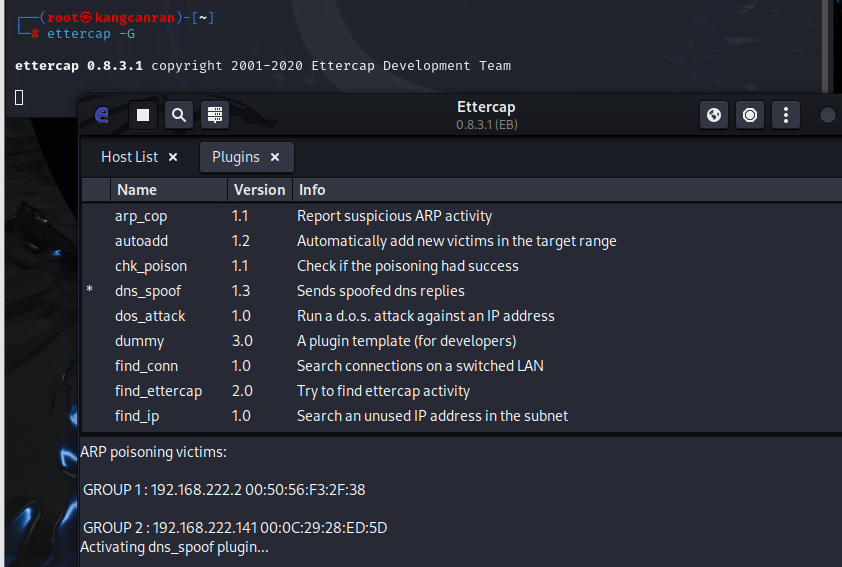 点击右上角三个竖点"Ettercap Menu"->plugins->Manage plugins,双击dns_spoof,启用DNS欺骗: