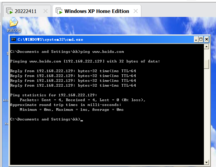 在靶机(windows xp)的命令控制行ping www.baidu.com,欺骗成功,返回IP地址是攻击机(kali)的IP地址:192.168.222.129: