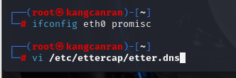 设置网卡eth0为混杂模式,进入DNS缓存表,在DNS缓存表中添加记录,IP为攻击机kali的IP,启用DNS spoof: