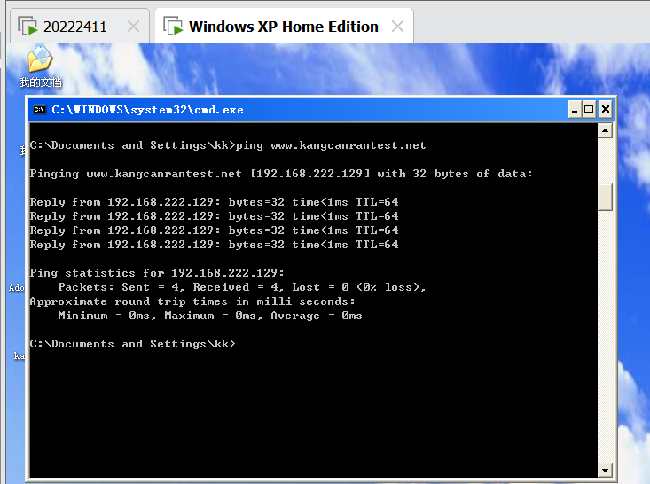 在靶机(Windows xp)的命令控制行ping www.kangcanrantest.net,返回IP地址是攻击机(kali机)的: