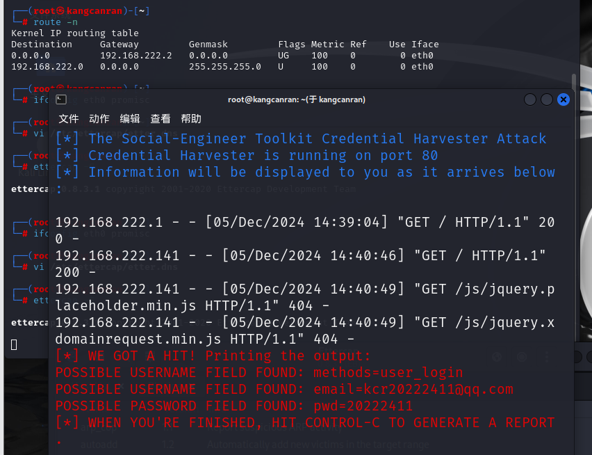 输入“邮件地址”和“登录密码”(我输入了kcr20222411@qq.com和20222411),在终端上也显示了连接信息及输入的信息,捕获成功: