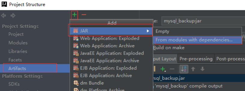 2.在弹出的窗口中左侧选中"Artifacts",点击"+"选择jar,然后选择"from modules with dependencies"。