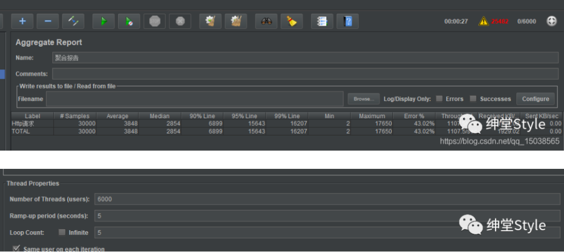 对单接口进行6000线程压测,每个线程请求5次,线程在5秒内创建完毕,当进行一半的时候,已经出现了请求响应时间过大及其错误率达到了43%。这个并发容量对于配置比较好点的服务器相对来说有点弱。