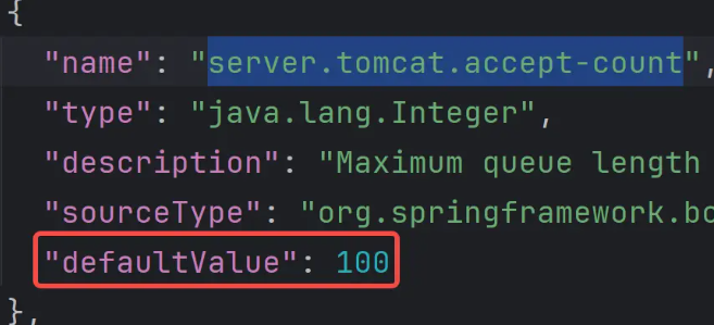 server.tomcat.accept-count:等待队列长度,当可分配的线程数全部用完之后,后续的请求将进入等待队列等待,等待队列满后则拒绝处理,默认100。