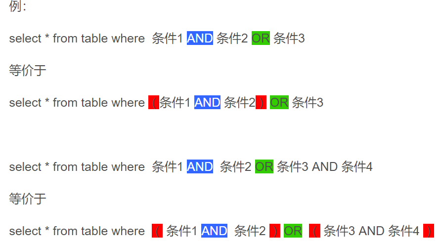MySQL中,AND的执行优先级高于OR。也就是说,在没有小括号()的干预下,总是先执行AND语句,再执行OR语句。