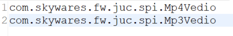 public class Mp3Vedio implements VedioSPI { @Override public void call() { System.out.println("this is mp3 call"); } }