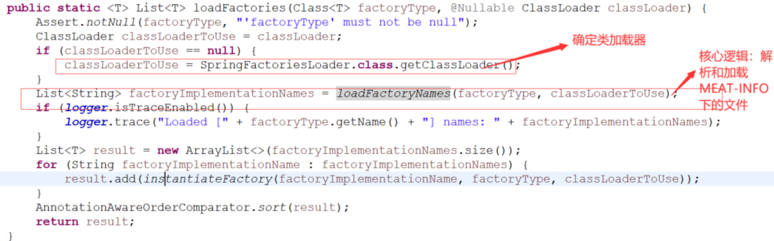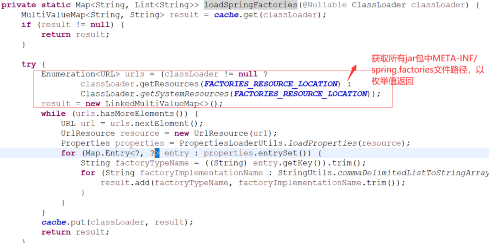 说明:获取所有jar包中META-INF/spring.factories文件路径,以枚举值返回。遍历spring.factories文件路径,逐个加载解析,整合factoryClass类型的实现类名称,获取到实现类的全类名称后进行类的实例话操作,其相关源码如下: