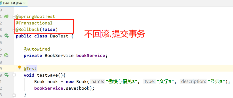 2 @Transactional相当于这两个注解 @Transactional@Rollback(true) → 即默认回滚
