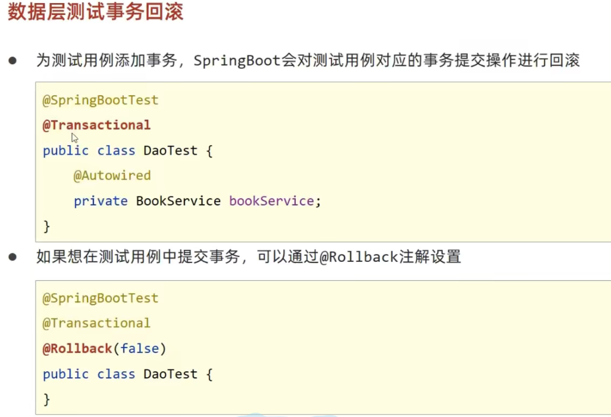 @SpringBootTest @Rollback(false) public class UserServiceTest extends BaseTest { @Test void testInserUser() { //向数据库增加一条用户信息 inserUser(User user); } @Test void testDeleteUser() { //删除一条用户信息 deleteUser(int userId); } }