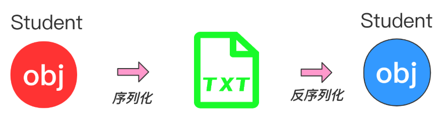 举个例子,对 Student 类对象序列化到一个名为 student.txt 的文本文件中,然后再通过文本文件反序列化成 Student 类对象: