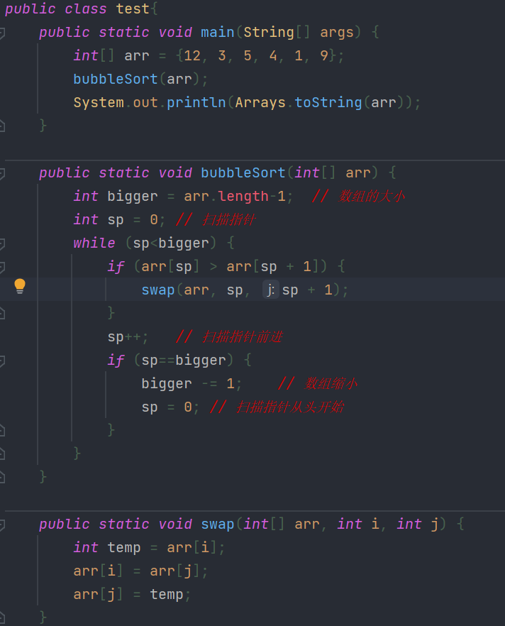 从左往右,依次扫描数组,比较相邻的两个数,若左侧的元素值比右侧的元素值大,则交换位置,这样一轮下来之后能够保证每次while循环的最后一个元素都是当前while循环的最大值。