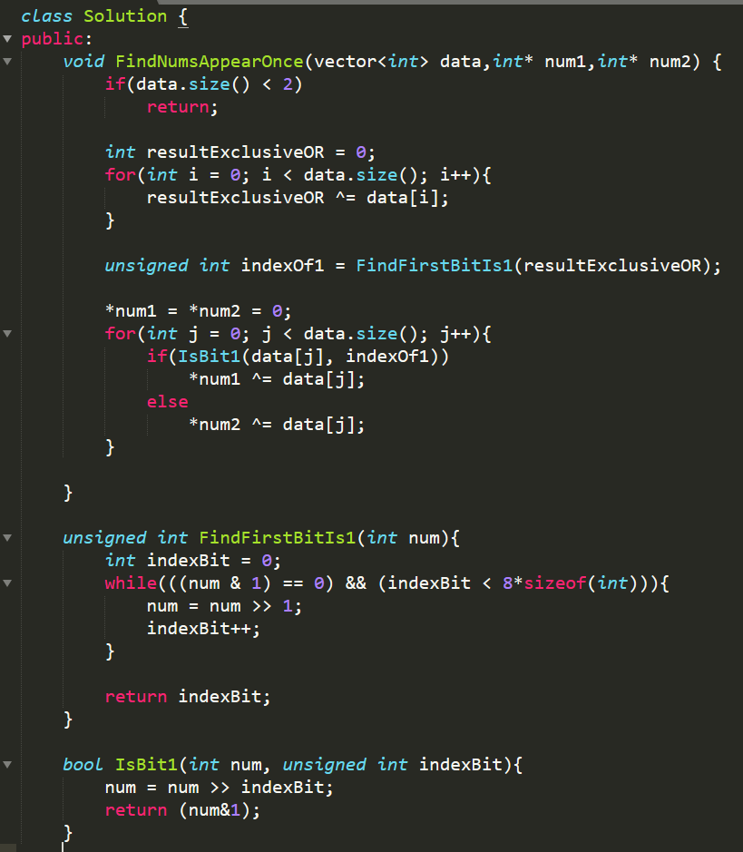 依照这个思路,我们来看两个数(我们假设是AB)出现一次的数组。我们首先还是先异或,剩下的数字肯定是A、B异或的结果,这个结果的二进制中的1,表现的是A和B的不同的位。我们就取第一个1所在的位数,假设是第3位,接着把原数组分成两组,分组标准是第3位是否为1。如此,相同的数肯定在一个组,因为相同数字所有位都相同,而不同的数,肯定不在一组。然后把这两个组按照最开始的思路,依次异或,剩余的两个结果就是这两个只出现一次的数字。