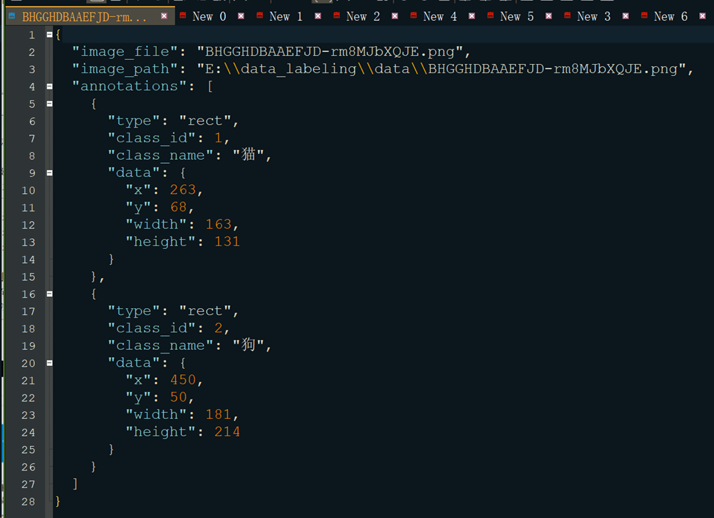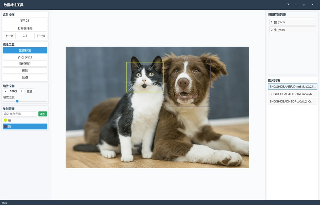 1. 基础操作 - 点击"选择文件"或"选择文件夹"来加载图片 - 使用左侧工具栏进行标注操作 - 保存标注结果到JSON文件,为COCO格式 2. 标注工具 - 矩形标注:拖拽鼠标绘制矩形框 - 多边形标注:点击多个点绘制多边形 - 类别管理:选择不同的标注类别 3. 快捷键 - Delete键:选中标注后,delete可以删除当前标注 - 按下标注删除按钮后,鼠标可以选中标注,此时可以鼠标单击删除,也可以按delete键删除 - Ctrl+Z:回退 - Ctrl+鼠标左键:拖拽图片 - Ctrl+鼠标滚轮:缩放图片 4. 注意事项 - 请确保图片文件完整且可读取 - 标注结果会自动保存到与图片相同的目录