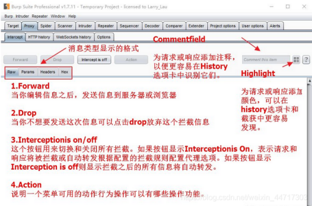 Burp 代理可以用来进行攻击,如:SQL 注入,cookie 欺骗,提升权限,会话劫持,目录遍历,缓冲区溢出。拦截的传输可以被修改成原始文本,也可以是包含参数或者消息头的表格,也可以十六进制形式,甚至可以操纵二进制形式的数据。在 Burp 代理可以呈现出包含 HTML 或者图像数据的响应消息。